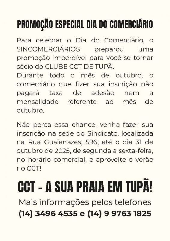 Vem curtir o calor no CCT!Comece hoje e só pague a partir de novembro Sem taxa de adesão — só em outubro!CCT — A sua praia em Tupã!